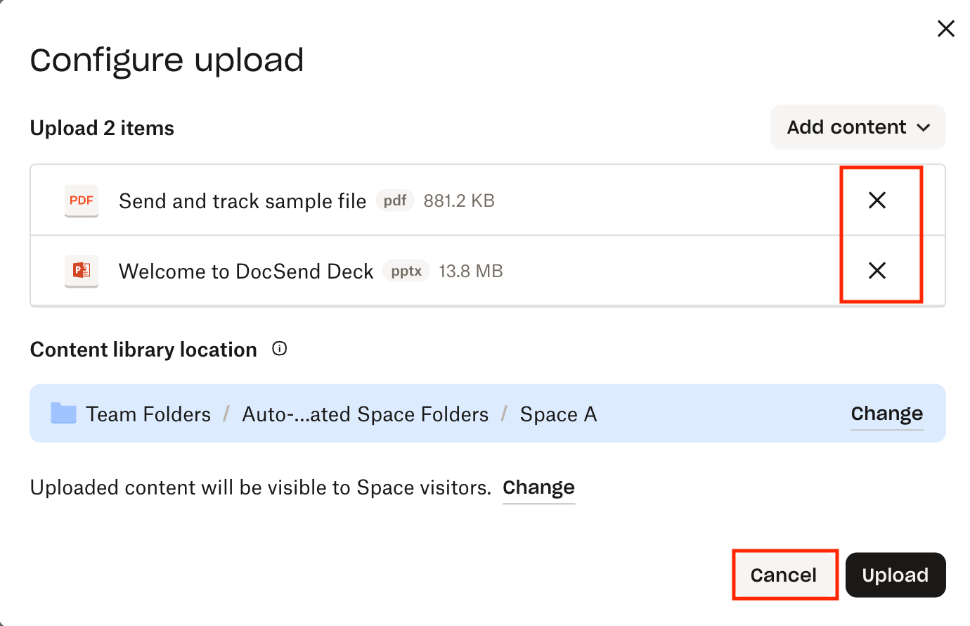Wenn Sie den falschen Inhalt hochladen und diese Aktion rückgängig machen möchten, klicken Sie neben dem zu entfernenden Inhalt auf „X“ (Entfernen) oder klicken Sie auf „Abbrechen“.