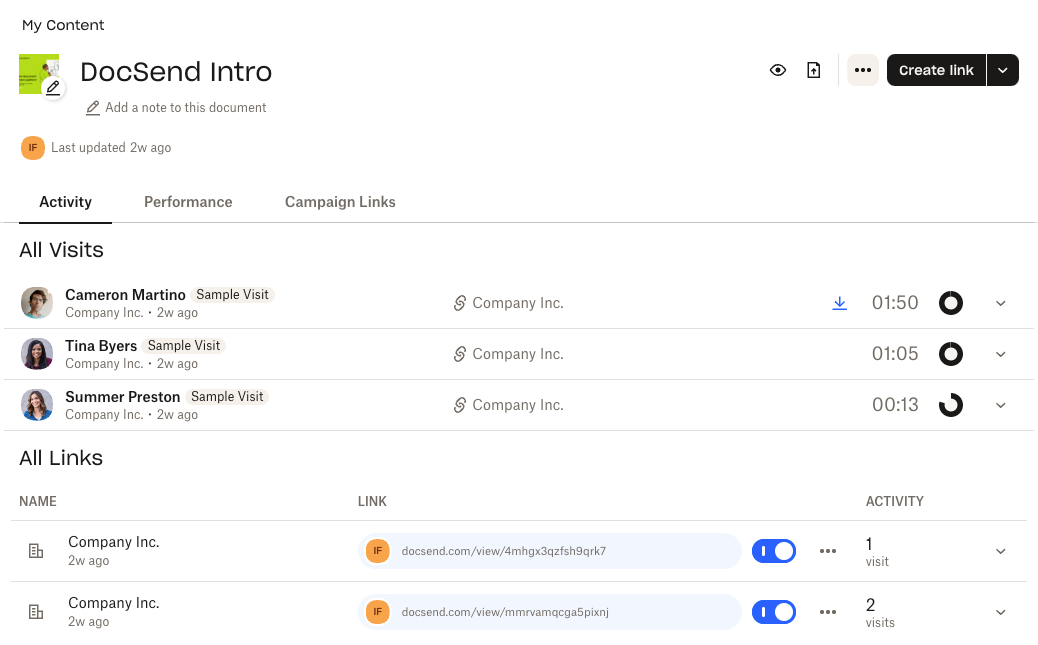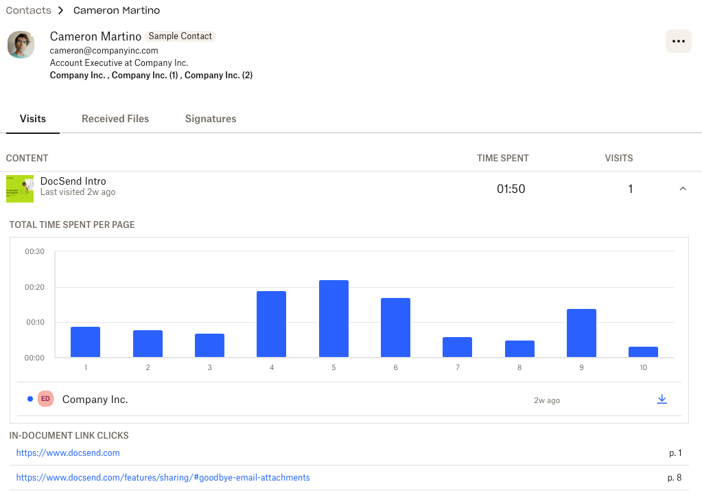 | Note: You’ll only see visit and signature data in a contact profile for documents you can already access in DocSend. |