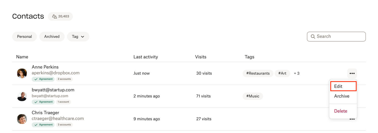 The Contacts tab will show the individual visitors, and all their most recent activities while viewing your content. You'll be able to filter through contacts across your team or personal contacts.