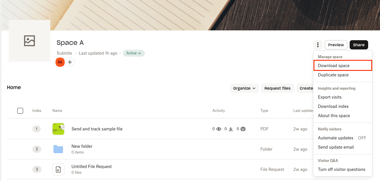 Puedes configurar una solicitud de archivos en tu espacio para que los visitantes puedan subir archivos directamente. Cualquier persona que tenga acceso al espacio podrá ver de inmediato los archivos que se hayan subido. Más información sobre solicitudes de archivos.