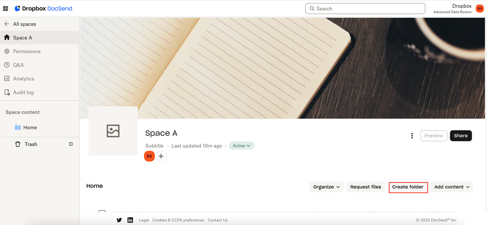 Une fois que vous avez créé un espace, il est temps d’ajouter du contenu. Selon le forfait que vous avez souscrit, vous pouvez ajouter jusqu’à 4 000 éléments à un seul espace. Si vous avez opté pour le forfait Advanced, Advanced Data Rooms ou Enterprise, vous pouvez utiliser des dossiers d’espace pour organiser davantage votre contenu. En savoir plus sur les limitations d’importation de fichiers.