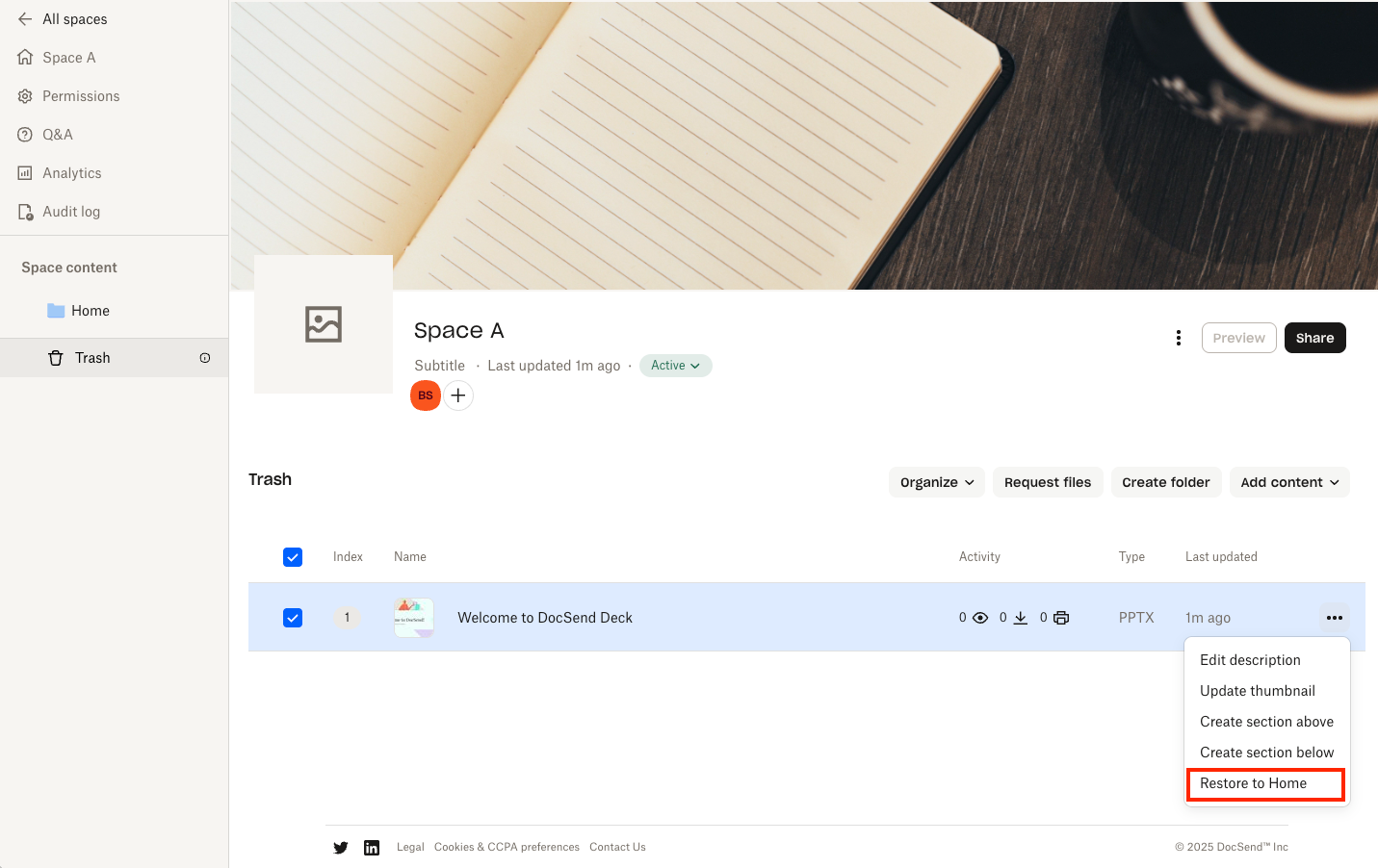 아카이브의 콘텐츠는 휴지통에서 왼쪽 사이드바의 홈으로 끌어다 놓거나, 파일 오른쪽에 있는 (옵션 더 보기)를 클릭하고 홈으로 복원을 선택하여 다시 스페이스로 옮길 수 있습니다.