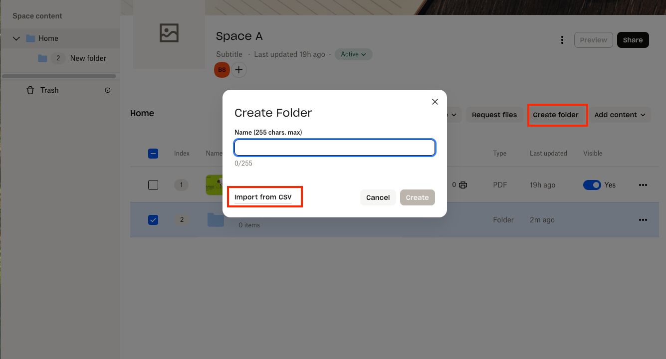 스페이스를 만들었다면 이제는 콘텐츠를 추가할 차례입니다. 사용 중인 요금제에 따라 하나의 스페이스에 최대 4,000개의 자산을 추가할 수 있습니다. Advanced, Advanced Data Rooms 또는 Enterprise 요금제를 사용하는 경우 스페이스 폴더를 사용하여 콘텐츠를 더 체계적으로 분류할 수 있습니다. 파일 업로드 제한에 대해 자세히 알아보세요.