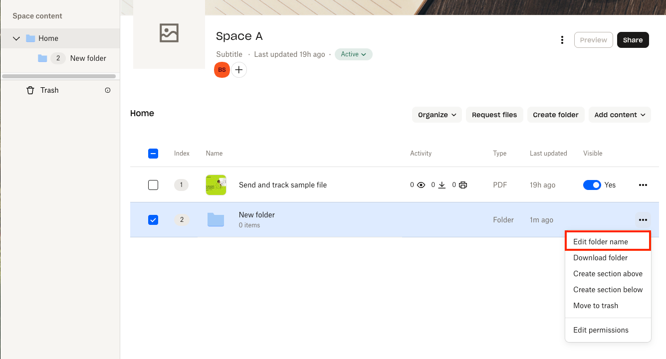 스페이스 폴더 이름은 언제든지 수정할 수 있습니다. 파일 이름 오른쪽에 있는 (옵션 더 보기)를 클릭한 다음 폴더 이름 편집을 선택하여 이름을 수정할 수 있습니다.